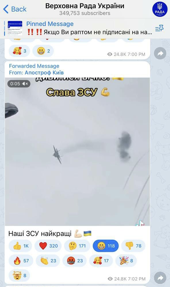 Τώρα σε μία ανάρτηση στο «Telegram», δημοσιεύεται στιγμιότυπο από μία υποτιθέμενη κατάρριψη Ρωσικού μαχητικού αεροσκάφους από φορητό αντιαεροπορικό σύστημα Ουκρανού στρατιώτη.