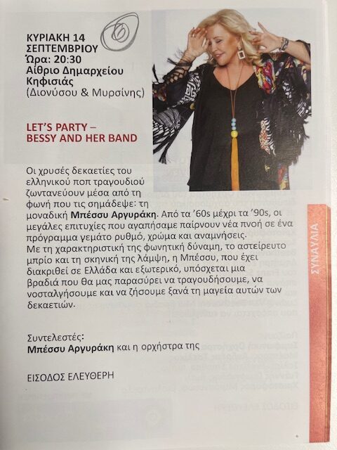 Την Κυριακή 14 Σεπτεμβρίου στα πλαίσια των πολιτιστικών εκδηλώσεων «ΜΕΝΑΝΔΡΕΙΑ 2025» είχαμε τη χαρά να δούμε και να ακούσουμε από κοντά τη μεγάλη Ελληνίδα Pop Σταρ κ. Μπέσσυ Αργυράκη!