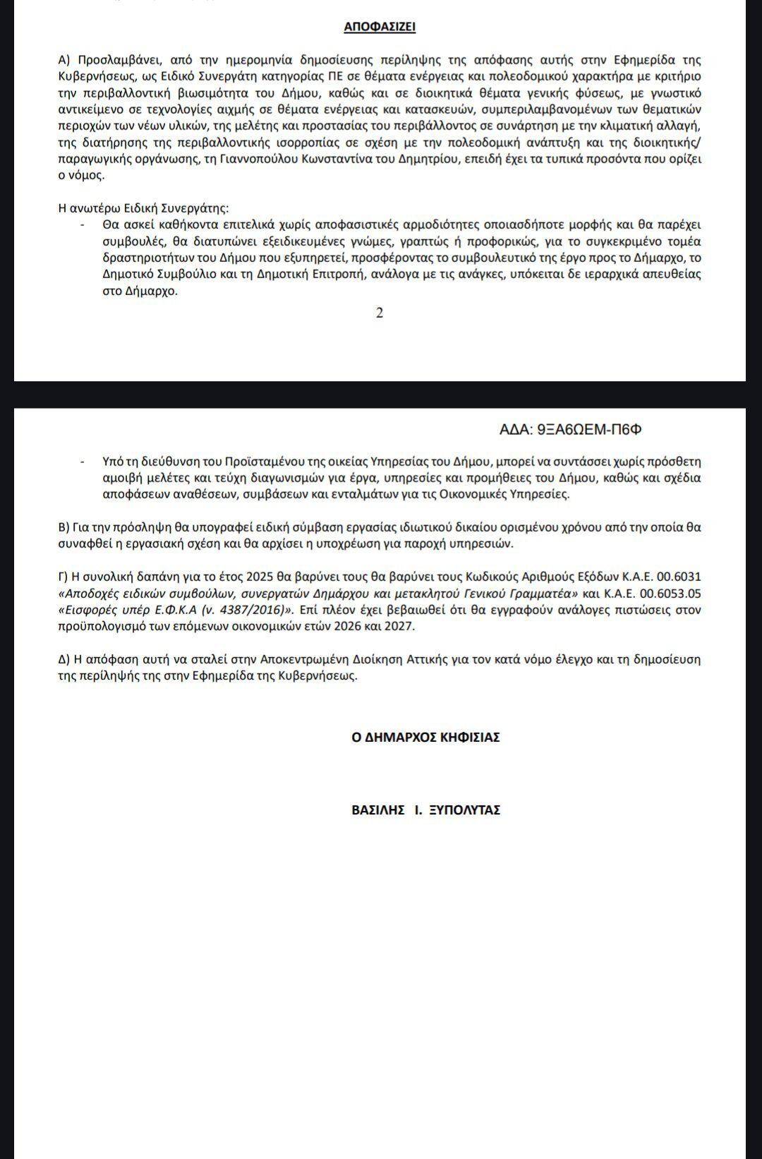 Στην Διαύγεια: Ειδική Σύμβουλος του Δημάρχου Κηφισιάς η Κα Κωνσταντίνα Γιαννοπούλου, Υποψήφια Δημοτική Σύμβουλος με την παράταξη ΝΑΙ που ηγείται ο  Δήμαρχος Ξυπολυτάς.