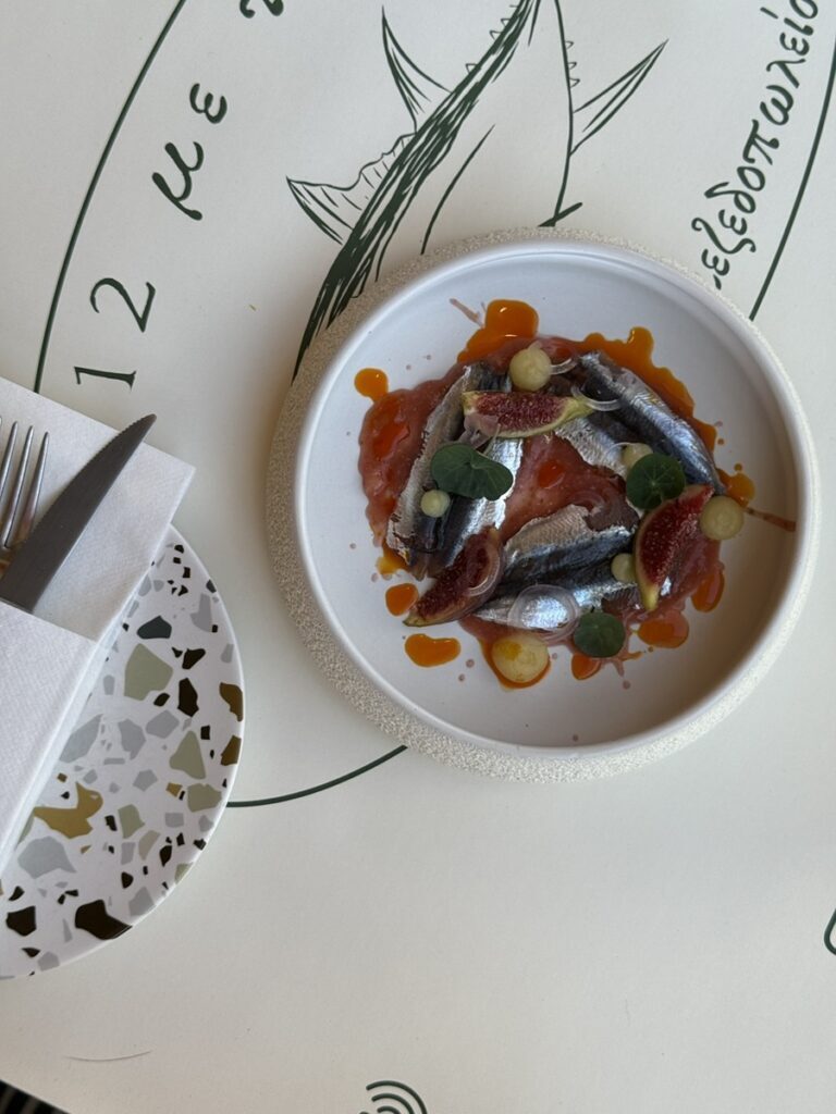 Ακολουθεί η σαρδέλα gravlax, παστωμένη σε αλάτι και ζάχαρη, που σερβίρεται με κρέμα σύκου, φρέσκο σύκο και πίκλα κρεμμυδιού. Το σύκο εμφανίζεται με αρκετές τεχνικές, χωρίς όμως να υπερκαλύπτει με τη γλυκύτητά του τα υπόλοιπα στοιχεία. Το αποτέλεσμα είναι ένα νόστιμο και ισορροπημένο πιάτο, με τη σαρδέλα να μην χάνεται.